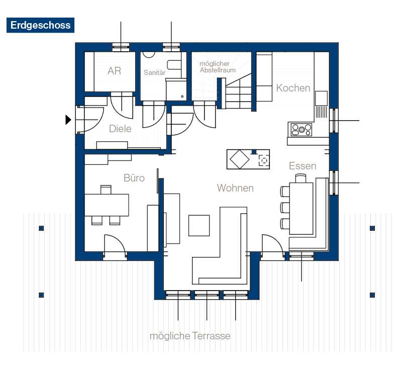 Für behagliche Wärme und ein gutes Gewissen sorgt dabei eine moderne und effiziente Wärmepumpe, die bereits in der Standardausführung enthalten ist und das Zuhause zukunftssicher macht. Ein weiteres, rund 11 Quadratmeter großes Zimmer im Erdgeschoss bietet die nötige Flexibilität für ein ungestörtes Home-Office oder ein einladendes Gästezimmer.